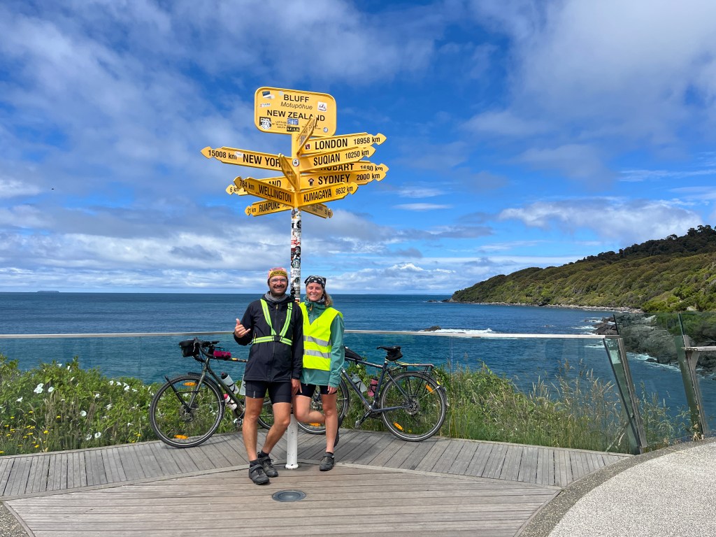 Ă lâoccasion de cet arrĂȘt, nous ferons un aller-retour Ă Bluff. Il fait lâobjet aussi du point final du Te Aeroa Trail, un long tracĂ© nord-sud de la NZ . Pour la forme, nous y sommes allĂ©s Ă vide pour une petite balade. Aller voir ce quâil se passe Ă cet endroit qui attise les convoitises pour la photo sous le poteau regroupant multiples panneaux de directions internationales. On y mangera trĂšs bien. On fera comme tout le monde en rentrant le clichĂ© dans la boite. La vue est belle.Â