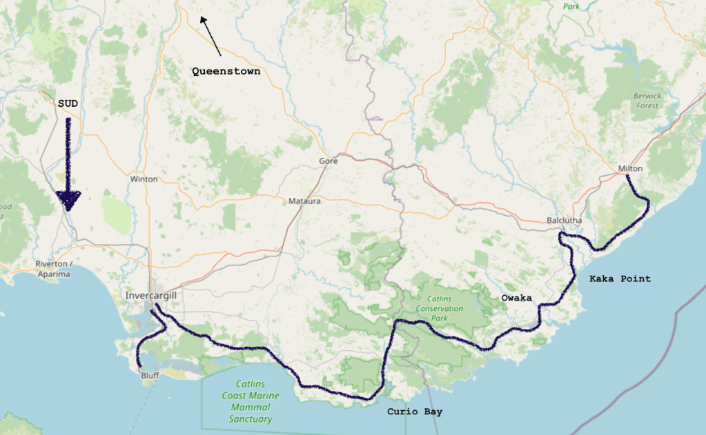 Atteindre le point le plus bas de Nouvelle-ZĂ©lande se rĂ©sume Ă aller Ă Slope Point. GĂ©ographiquement et prĂ©cisĂ©ment, il est lâendroit le plus austral du pays. Pour nous, ce sera Curio Bay, aller jusquâĂ Slope serait nous ajouter 12 km aller-retour sur gravel road dont nous ne sommes plus fans pour le moment.Â