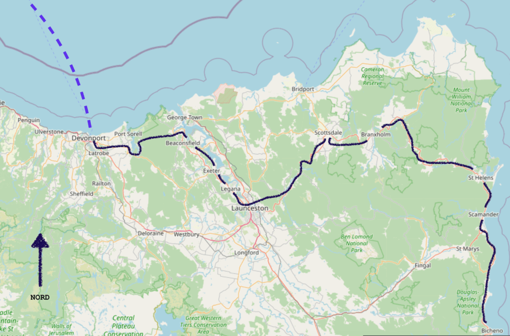 Sur ce chemin, aprĂšs le dĂ©jeuner, aprĂšs la fatigue dâĂ©coute, aprĂšs avoir compris pourquoi nous avancions vite (vent de dos !), nous voilĂ arrivĂ©s Ă Bicheno.