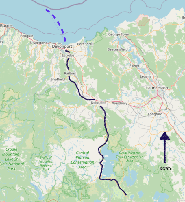 En quoi consiste cette remontĂ©e vers le nord ? Une presque ligne droite qui monte pendant trois bons jours pour redescendre au niveau de la mer. Nous ferons quatre arrĂȘts jusqu’Ă atteindre Devonport.